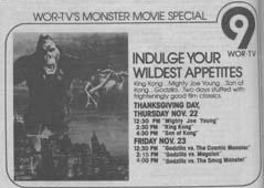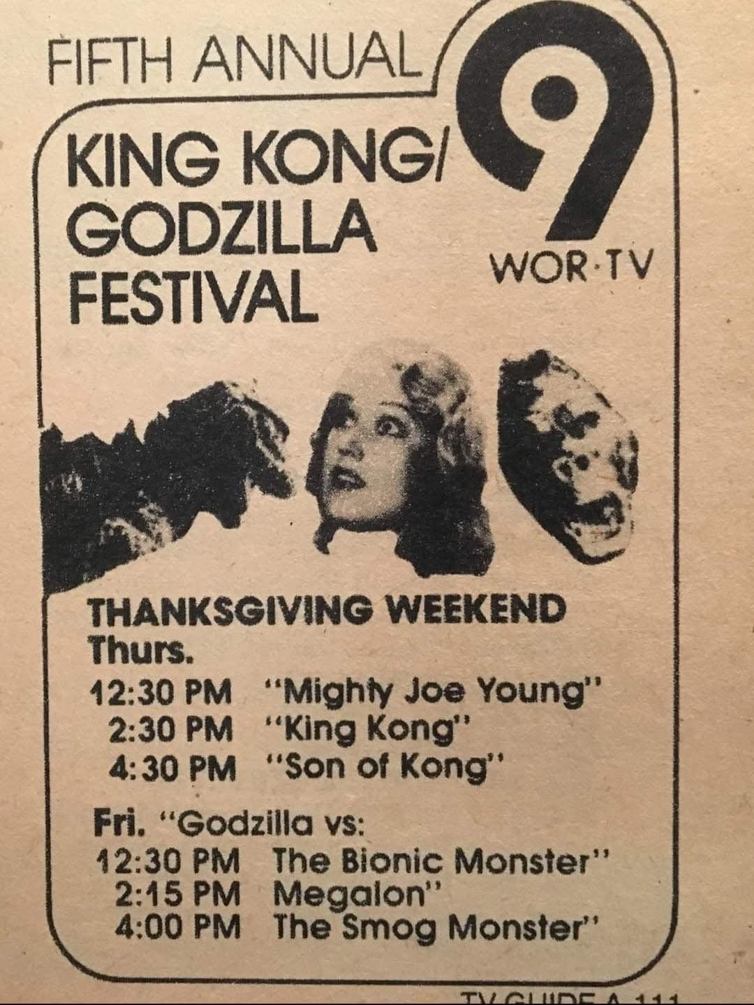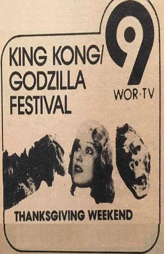 | "King Kong/Godzilla Festival" was an annual creature horror movie show presented by WOR-TV Channel 9 in New York, New York, USA; every Thanksgiving on Thursday & Friday. The show likely ran in the mid 1970s for at least five years; usually screening the same movies, sometimes with an extra movie squeezed in.