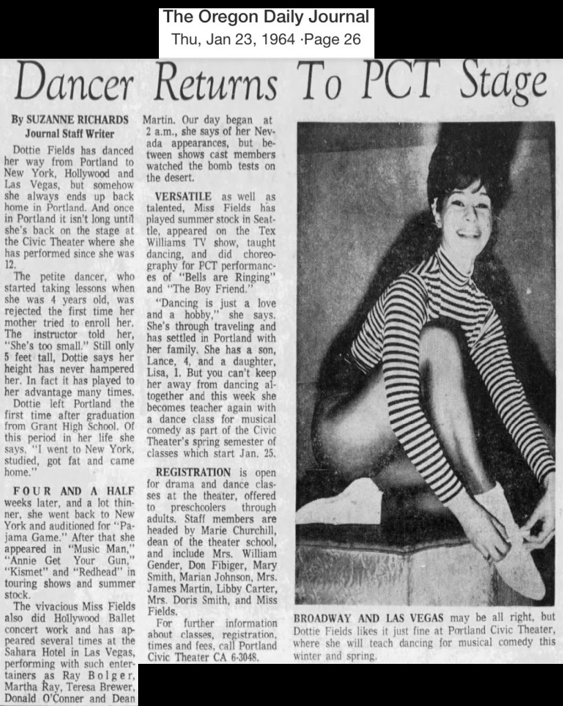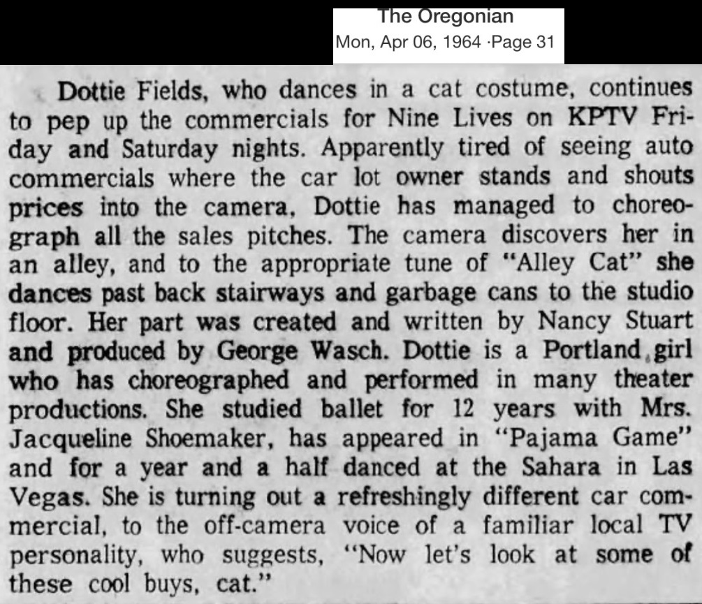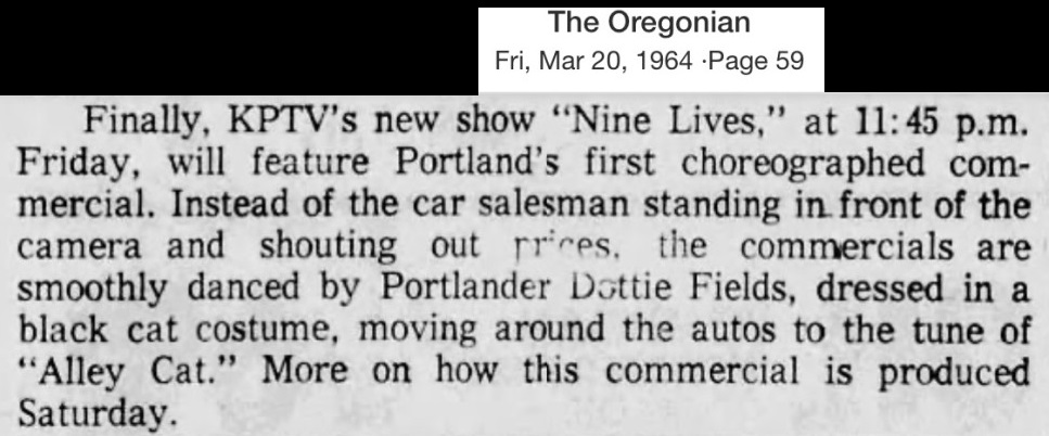 Of interest, Portland's first choreographed commercial was on "Nine Lives Theatre"; with Dottie Fields dressed in a black cat costume, moving around the cars for sale to the tune of "Alley Cat".