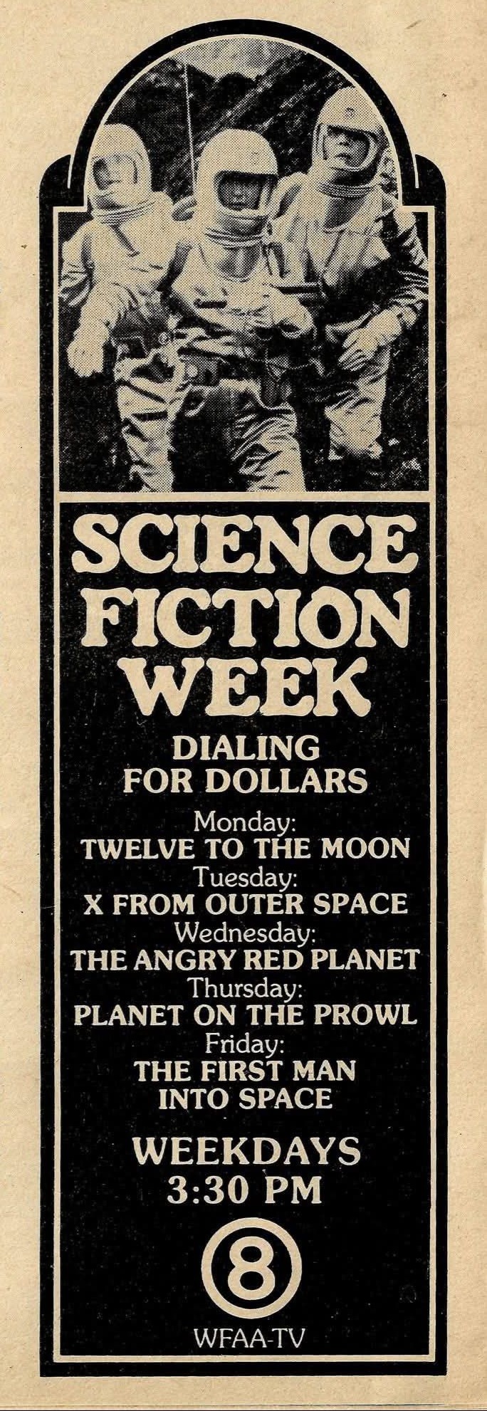 | "Science Fiction Week" was a non-hosted weekday screening of science fiction movies on WFAA-TV, Channel 8 in Dallas, Texas, USA; probably around the mid 1970s. The movies were screen for one week (Monday-Friday) at 3:30pm.